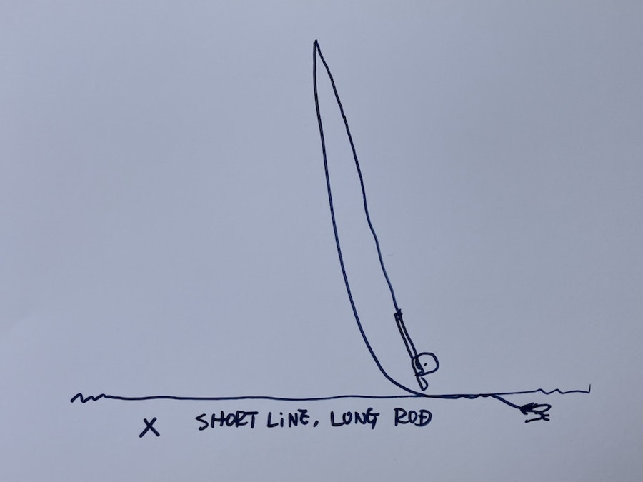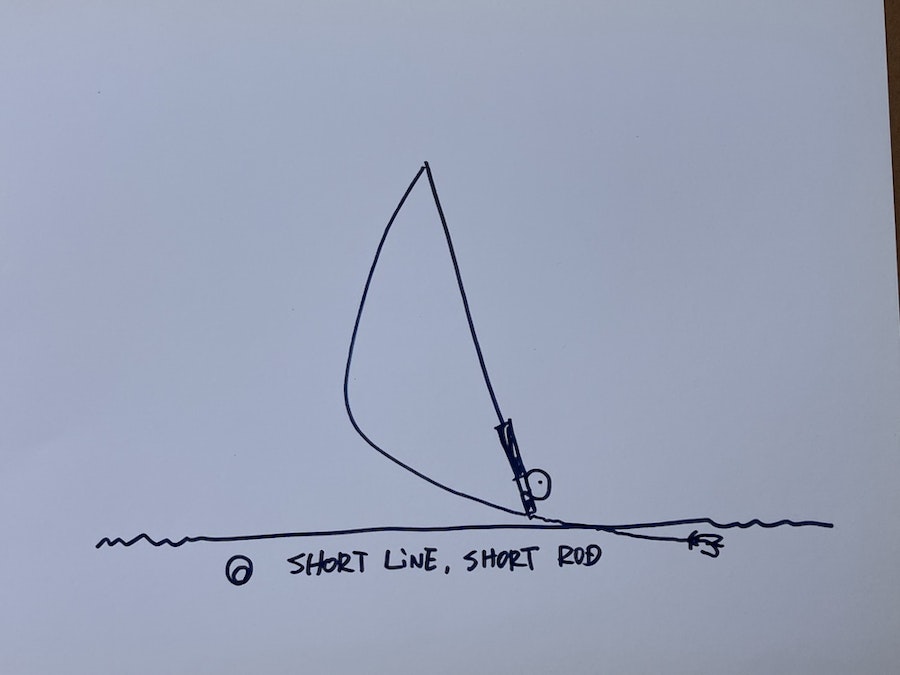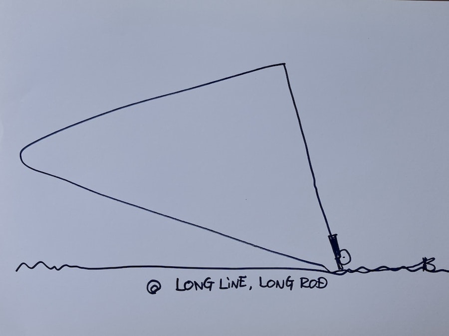 スペイ全般に関して、この関係性は簡単に表すことができます。長いラインを使うときには長いロッド(ベリーが70フィートあるフルラインを使うならたとえば16フィートの竿)、短いラインを選ぶときには短いロッド(たとえば15フィートのスカジットヘッドに標準的な長さのシンクティップを使うなら11フィートの竿)を使うのがベストです。スカジットは極めて柔軟性の高い方法論ですが、かつてロッドの200%が適切なスカジットヘッドの長さの目安と言われていました。いまはそれよりもずっと短いヘッドも出てきており、バリエーションは豊富です。いずれにせよ、スカジットヘッドにとても長いロッドを組み合わせてしまうと、簡単にDループが後方に抜けてしまい、ブッシュを釣ってしまいますし、うまく前に飛んでも距離は伸びません。どうしてもその組み合わせを使わなければならないとしたら、あえて深く立ち込むか、キャストする手の位置を通常よりずっと低くするなどの調整が必要です。